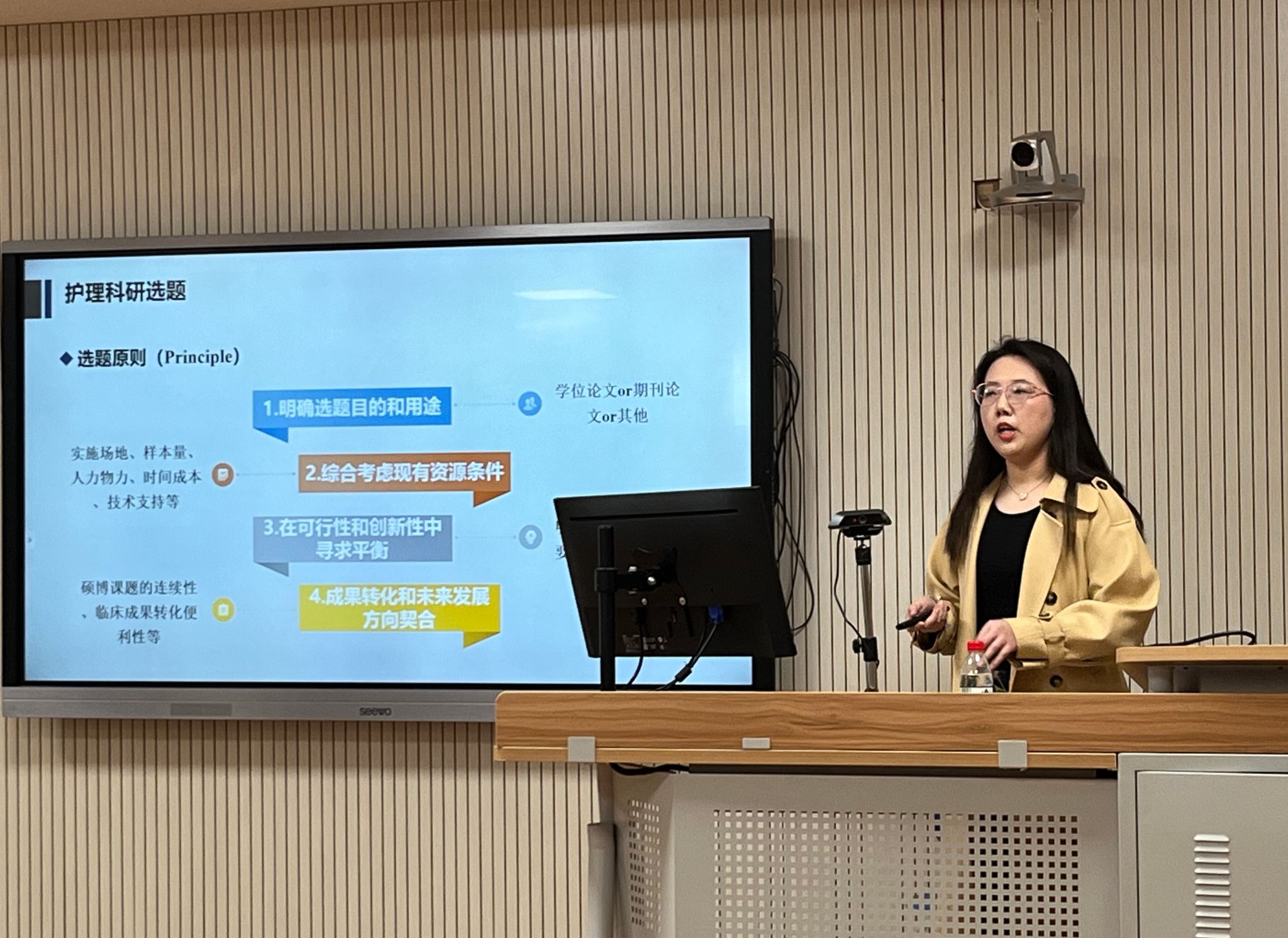 唐涵就“护理硕士科研方法及常见问题解析”作主题演讲。她首先详细介绍了科研选题的原则与方法;其次,阐述了一些不同研究设计过程中容易出现的问题,以及研究设计环节中需要注意的各项细节;然后,以自己的课题为例,分层剖析如何紧贴研究主题开展写作;最后,分享了自己的科研心得体会,鼓励每一位护理科研人正确看待困难,不畏艰难,勇往直前。唐博士以“过来人”的身份,讲述科研基础知识和自己的科研经历,深入浅出,娓娓道来,从理论到实践,为与会师生提供了宝贵的经验和建议。