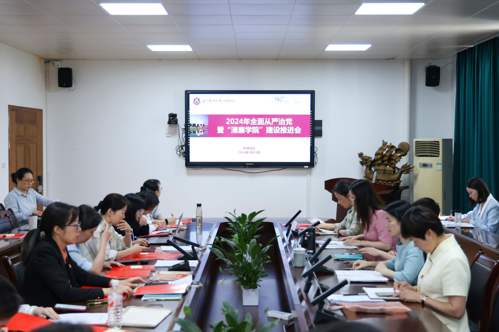 5月15日下午,学院在7C306会议室召开2024年全面从严治党暨“清廉学院”建设推进会。院党委书记王敏出席会议并讲话,院党委副书记、纪委书记金晓童主持会议并作工作报告。院长蔡福满、副院长黄小琼、副院长董超群,学院纪委委员,各党支部书记,各科室(教研室)负责人、全体辅导员与会。