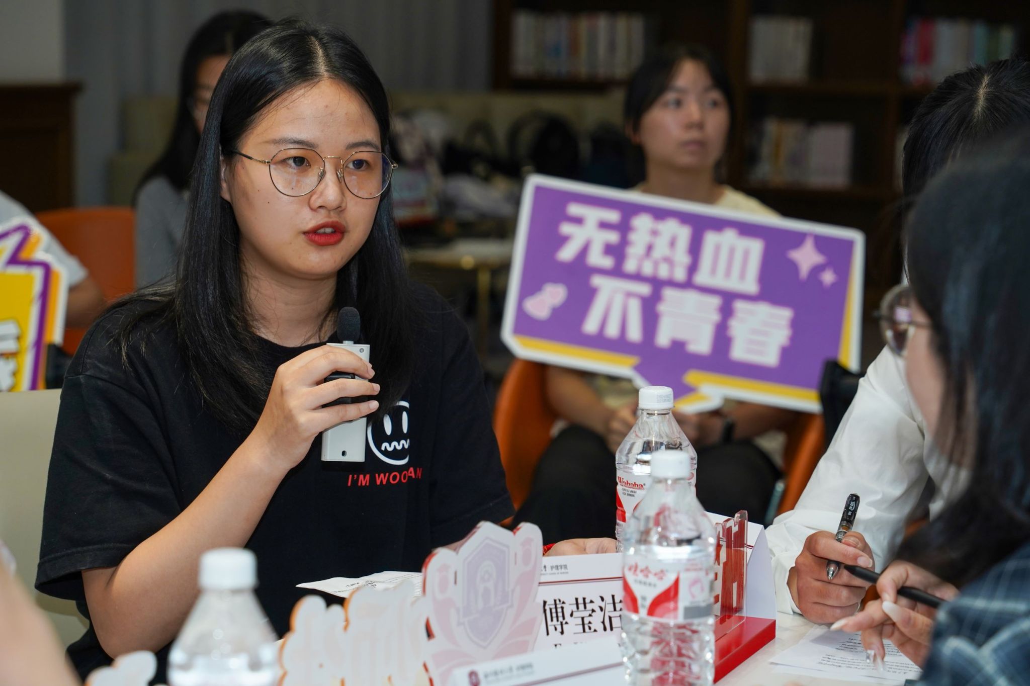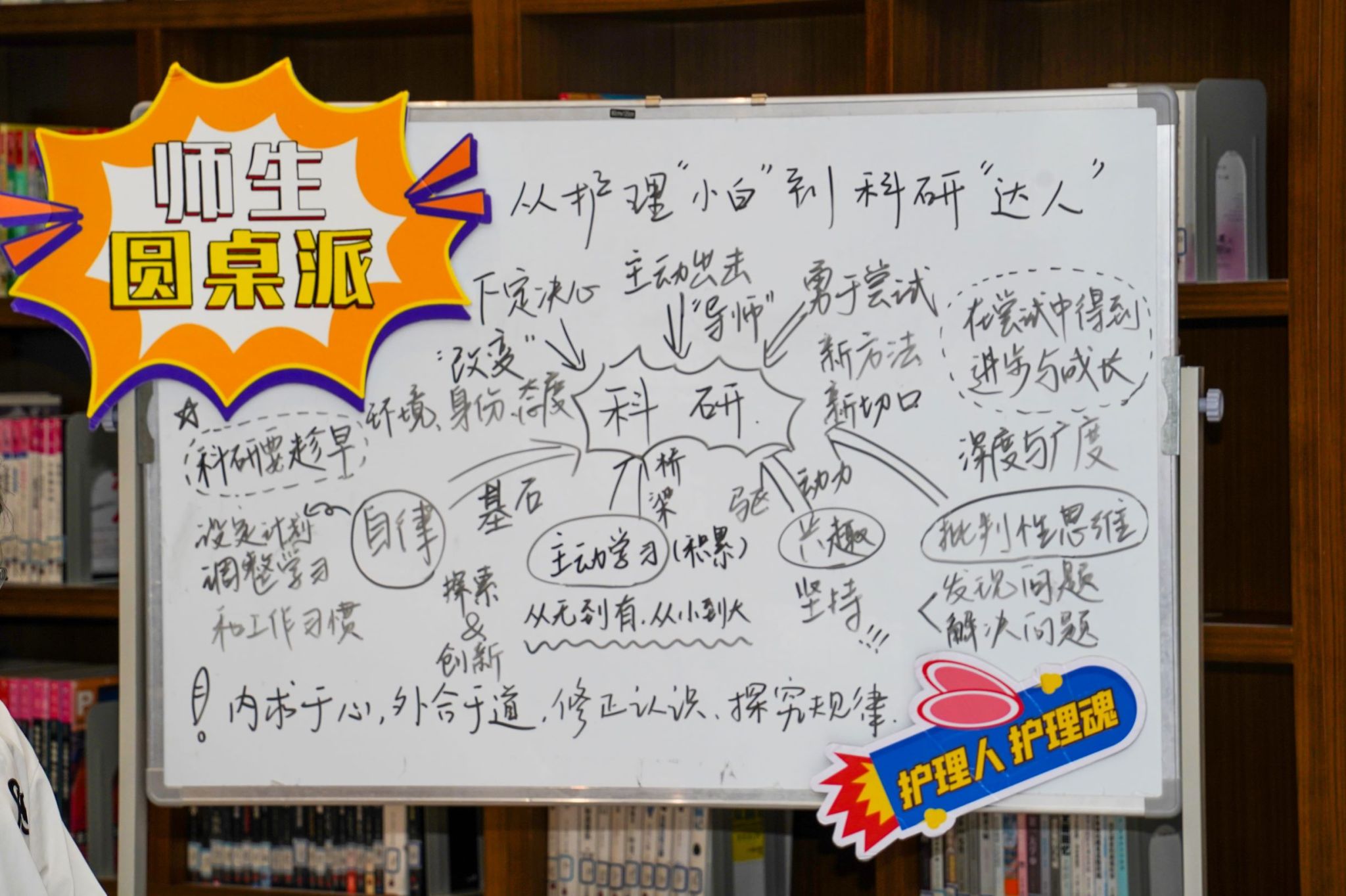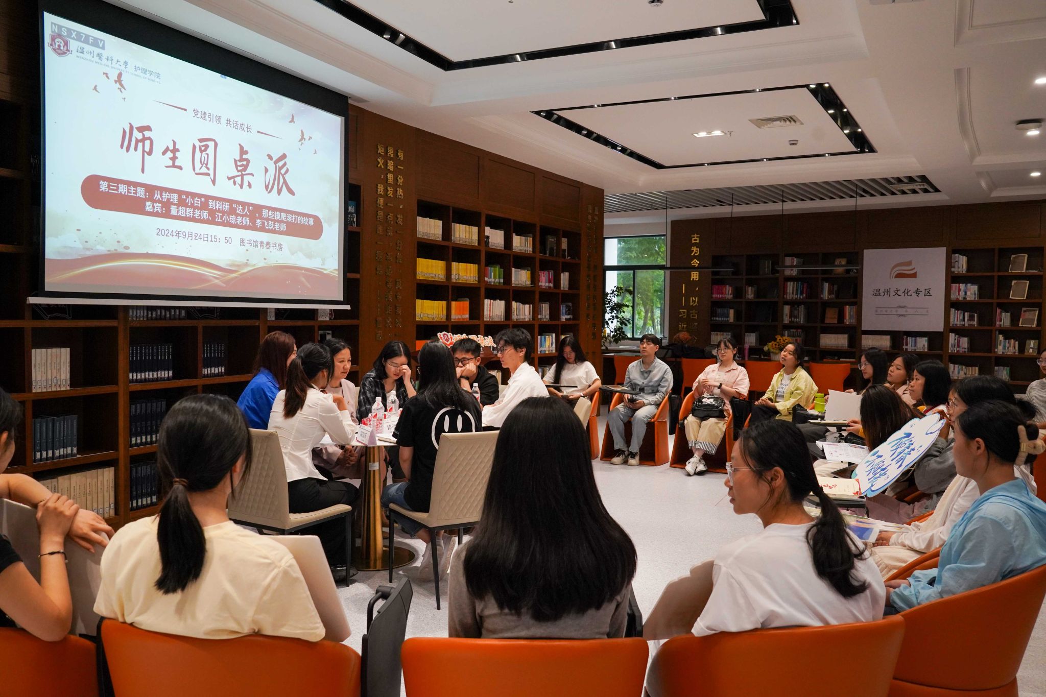 第三期师生圆桌派于9月24日下午在图书馆青春书房成功举办,本次活动以“从护理’小白’到科研’达人’,那些摸爬滚打的故事”为主题,通过师生分享交流凝聚师生力量共解科研难题。本次活动嘉宾为萝莉岛 副院长董超群、萝莉岛 教师江小琼、李飞跃老师,研究生代表傅莹洁、梁成龙,和本科生代表邓奕晗同学,现场观众由部分学生党员、入党积极分子代表及线上2024级大一新生组成。