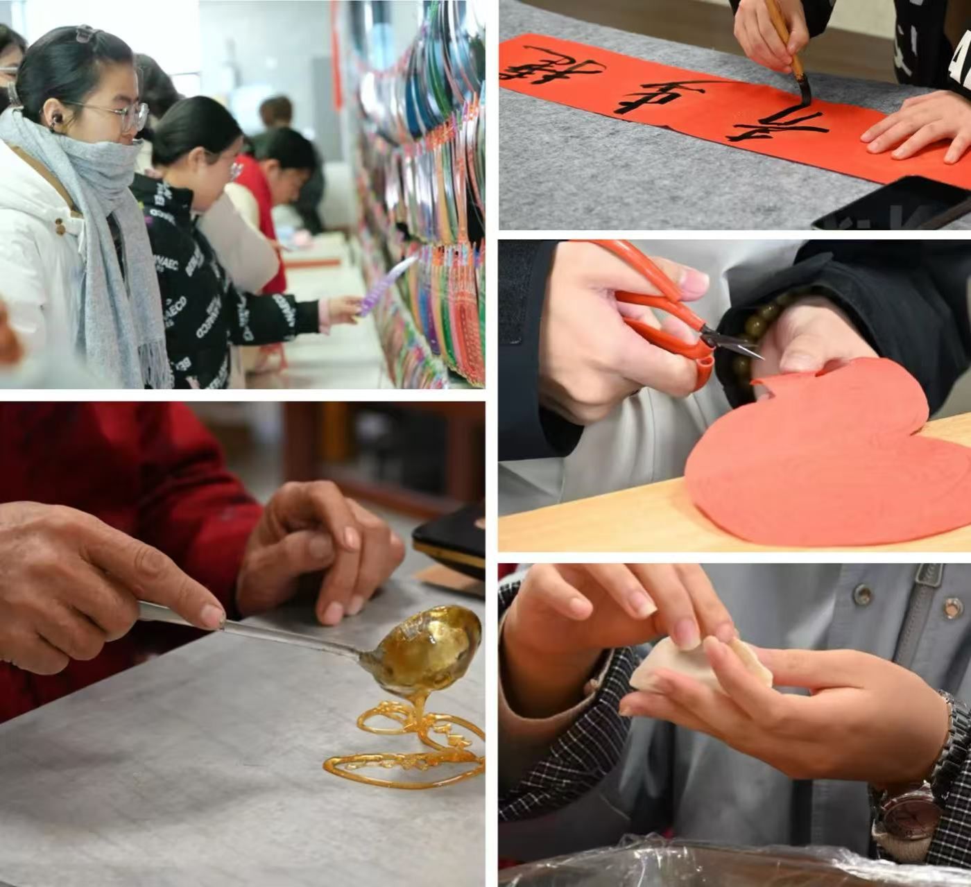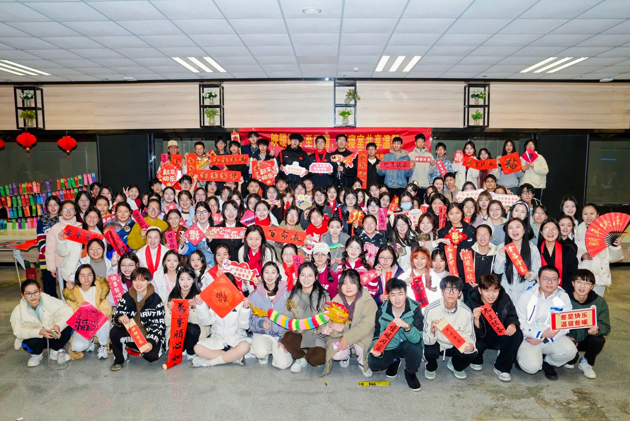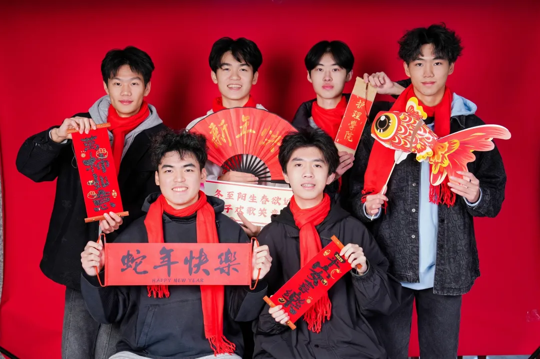 在冬至游园区中,同学们热情高涨,在猜灯谜区踊跃竞猜,愈战愈勇,在糖画区等待精心制作的糖画图案;在写对联和剪纸区,擅长书法与剪纸的同学们现场书写与裁剪,为同学们提供新年装扮寝室小家的对联与窗花;在寝室全家福拍摄区,以寝室为单位拍摄属于小家的首张新年全家福,搭配手幅、围巾、蛇年吉祥物等道具,摆出特色造型,用镜头记录下这份属于寝室的“寝室全家福”。