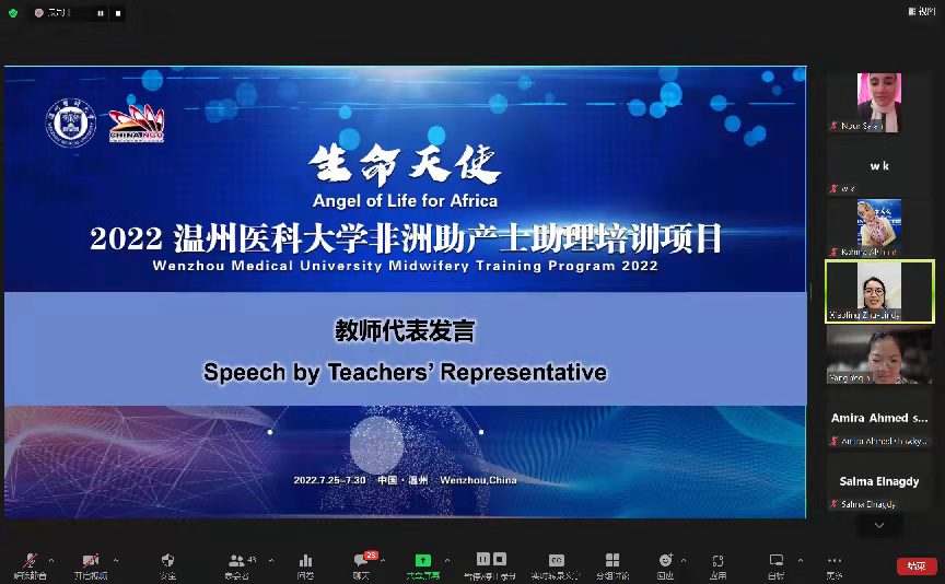 杨晔琴副院长首先进行结业致辞,向本次线上授课的优秀教学团队表示感谢。老师们在备课讲课过程中付出大量心血,十分关心学员们的反馈,积极为学员们答疑解惑,不断提升自身教学水平。一周的线上学习,学员们不仅针对性地学习了助产知识,还特别体验了传统中医药课程,加深了对中国传统文化的了解。她对参加此次项目的学员们成功完成培训课程表示祝贺,希望学员们掌握相关的助产技能知识并带回到自己的国家,在实际生活中学以致用。学院也将持续支持助产士助理培训项目,希望对改善非洲孕产妇及婴儿的健康状况,促进中非友好关系的发展发挥一定的积极作用。