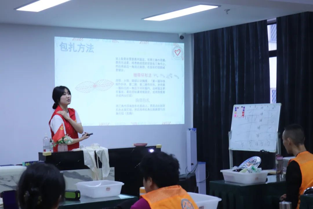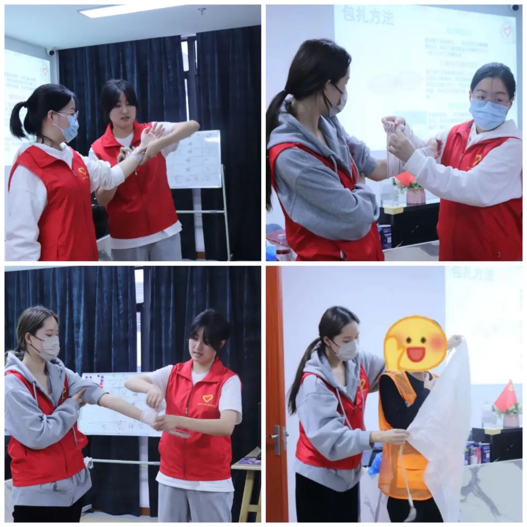 在本次急救知识课堂活动中,党员志愿者们从急救包扎的重要性开始,分别讲解了包扎的基本分类、常见方法以及注意事项等。通过理论讲解、现场演示与互动,帮助同学们更好地掌握包扎方法。