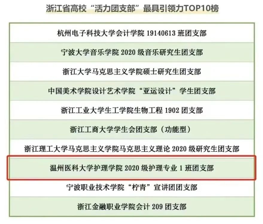 经团省委、省学联评审,萝莉岛 20护理1班团支部成功入选2022年度浙江省高校“活力团支部”最具引领力TOP10榜!(我校共有6个团支部入选)