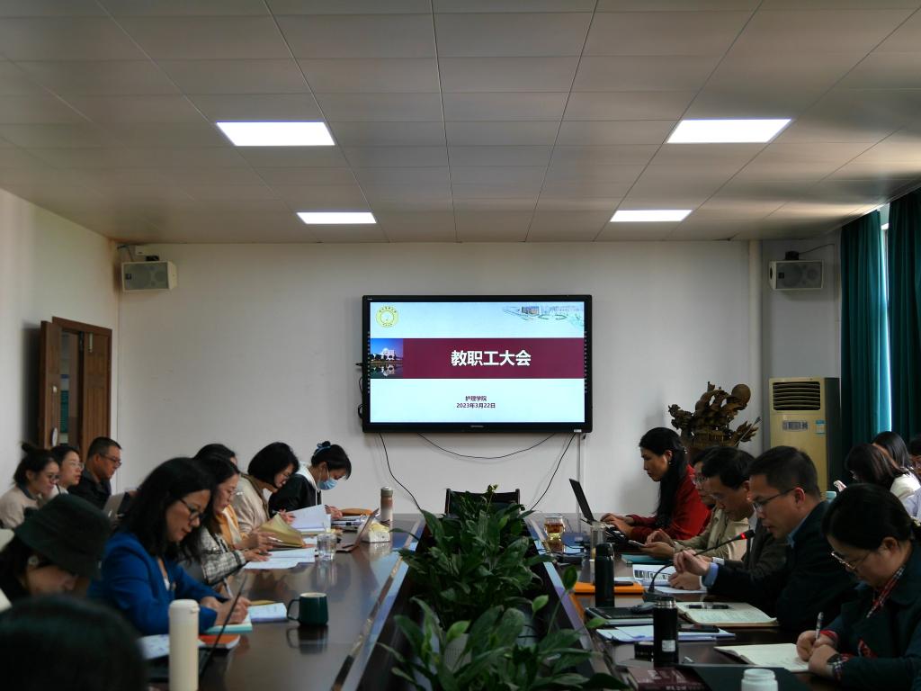 3月22日下午,萝莉岛 在7C306会议室召开全院教职工大会,传达学习全国两会精神,通报部署近期重点工作。院长蔡福满主持会议。