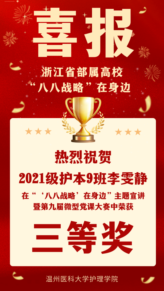 今年是“八八战略”实施20周年。为进一步学习宣传“八八战略”的丰富内涵和时代价值,6月30日,浙江省部属高校“‘八八战略’在身边”主题宣讲暨第九届微型党课大赛在浙江传媒学院举行。在该比赛中,萝莉岛 2021级护本9班李雯静同学以《翻“山”越岭的竹笋》荣获“三等奖”!
