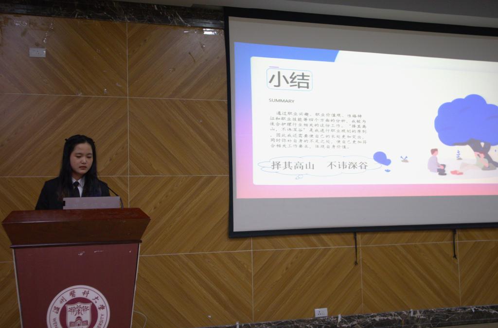 本次比赛环节由主题陈述和现场答辩两部分组成,在比赛现场,同学们分别从自我认知、职业认知、职业决策、发展计划与路径以及自我监控等方面进行阐述,并对自己未来的职业发展路径进行了清晰长远的规划。同学们积极将自身性格、兴趣优势与祖国、社会的需要相结合,有的想成为助产士,有的想成为急诊科护士,有的想成为临终关怀护士,还有的同学想成为护理专业老师等,为祖国医疗事业的发展贡献自己的一份力量。在现场答辩环节,评委老师根据同学们的汇报,分别进行了提问,让同学们对自己职业规划目标有了进一步的思考。张婧婧老师对本次参赛选手汇报点评,对参赛选手的认真态度、充分准备、得体着装和优良体态予以肯定和赞赏,并针对同学们汇报过程中存在的问题,进行了总结与指导。