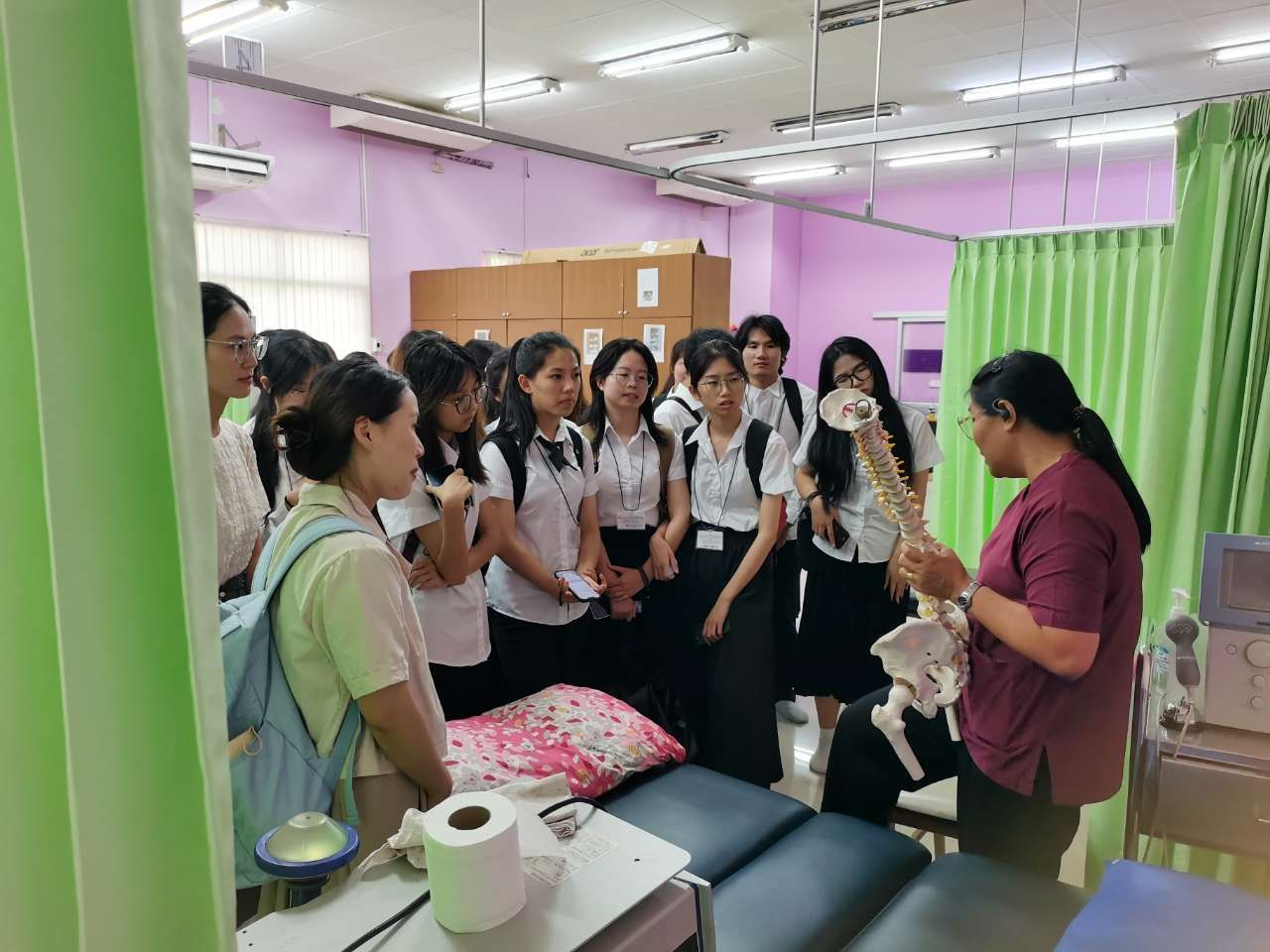 在校内物理康复治疗中心,Dr.Rungnapa向我们展示了针对肌肉关节损伤、肩关节劳损、中风等不同疾病的治疗设备。参观过程中,同学们还一起体验了手膜制作,在愉快的氛围中掌握了各种治疗小技巧。