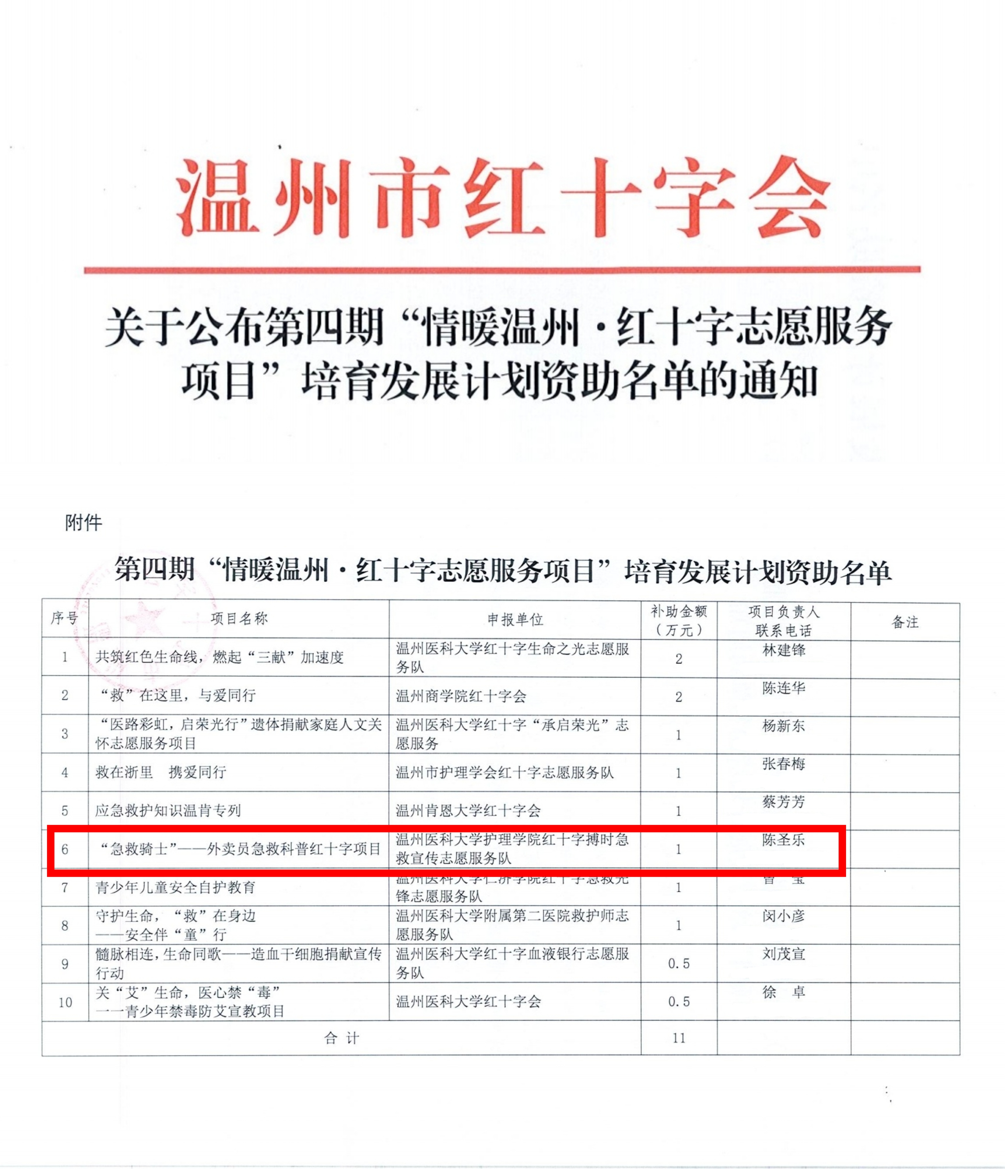近日,温州市红十字会公布第四期“情暖温州·红十字志愿服务项目”培育发展计划资助名单,萝莉岛 红十字搏时急救宣传志愿服务队的“急救骑士”——外卖员急救科普红十字项目志愿活动项目成功入选。