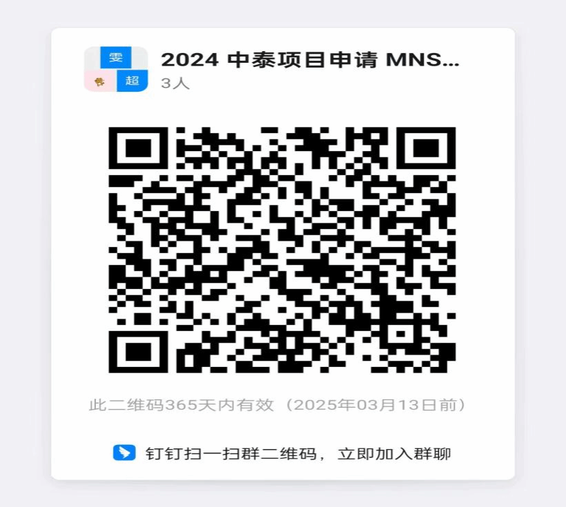 (3)注意事项:申请人应准确填写个人信息并提供真实材料,因信息填写错误、填报虚假信息而造成不能录取的,后果由申请人本人承担。申请人请于2024年5月10日前完成申请材料的上交。发送报名材料后请钉钉扫码加入2024年中泰项目申请群。