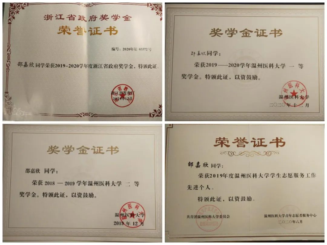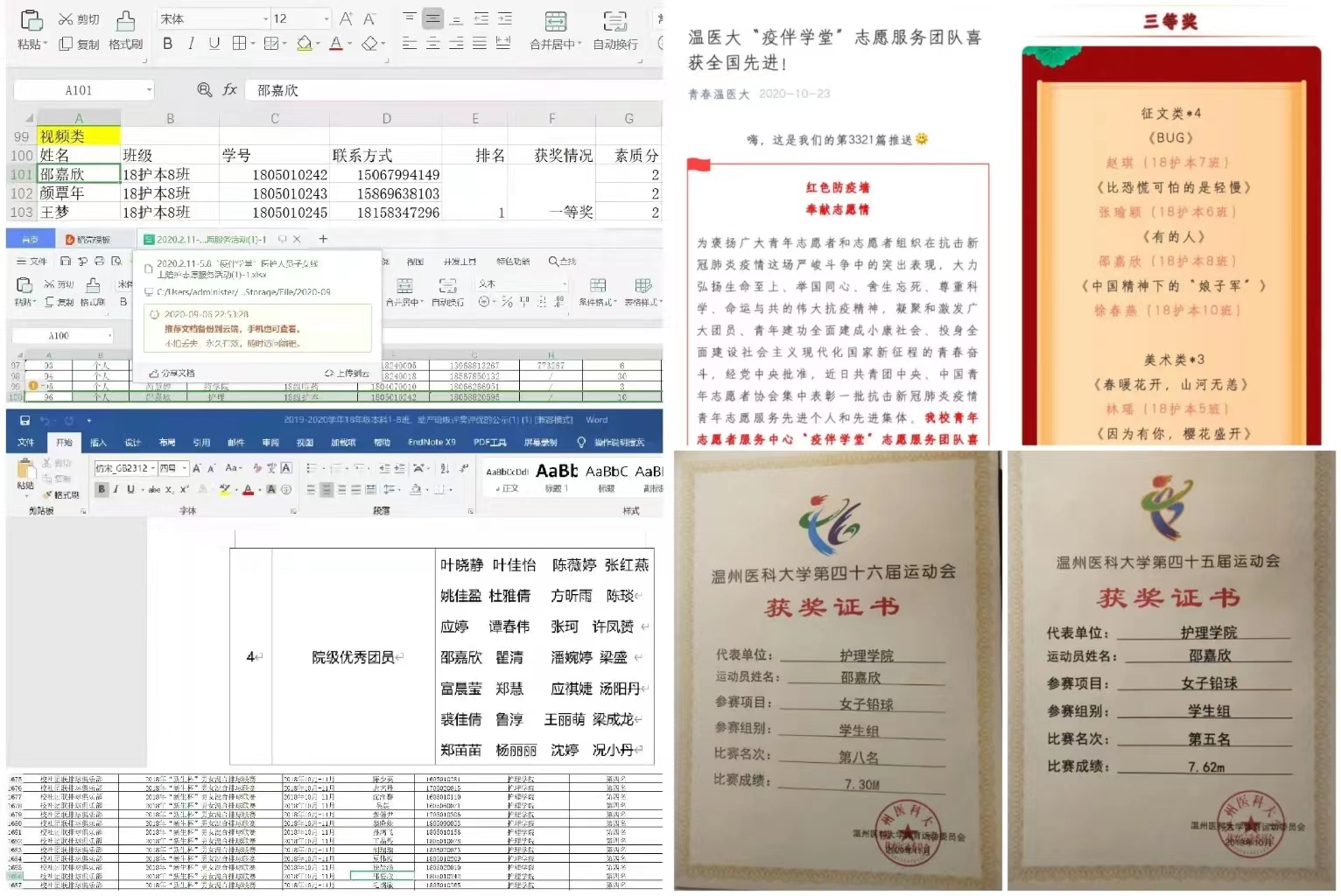 曾累积获得省政府奖学金、校一等、校二等奖学金、院级优秀团员、2019年度萝莉岛 学生志愿服务工作先进个人、原创诗歌获萝莉岛 疫路“护”行·征文类三等奖及学院“搏时”云文创活动(急救知识科普)视频类一等奖等多项荣誉。