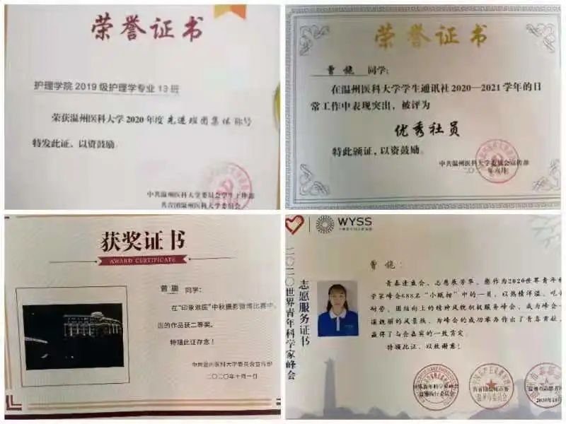 曾旎刚进入大学时跟很多同学一样也比较迷茫,但在良好的学习氛围感染下,她进一步了解了这个专业,打破了对这一专业的固有偏见,并逐步喜欢上了它。学习在她心中永远占据着最重要的位置,在稳抓学习的同时,她也会跨出舒适圈 ——“破界”担任学生工作。她在班级里担任团支书,作为老师和同学之间消息的桥梁,及时传达信息,带领班级获得校先进班集体、阳光下的诵读一等奖等荣誉。大一的时候她加入过学生通讯社和校青年志愿者服务中心,疫情期间,她曾担任过一段时间的测温志愿者,为学校防控献出了自己一份小小的力量。还在学生通讯社任职当特聘记者,去年也成为了2020WYSS的学生记者之一,主要活动跟着摄影部去往多地拍照,记录美好的故事和活动。在这些经历中她不仅充分发挥了自己摄影的特长,负责推送主题,同时还积攒了很多素质分。此外,她也告诫同学们:“我还是认为学习是第一位的,玩一定是有个限度的。”这些学生工作为她创造了很多机会,也提升了她的组织协调和应急能力。她踏实学习,勤勉奋进,大二时综测排名第一便是她注重全面发展并且刻苦努力的结果。曾旎表示,优秀拼的从来不是天赋,而是迎难而上的能力。