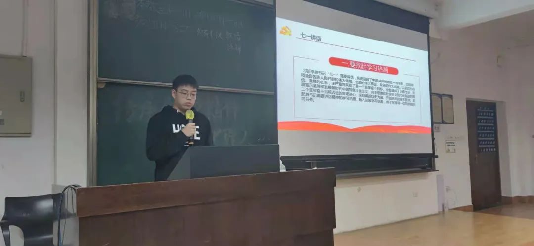 团日活动现场,团支书带头用微党课的形式领学了习近平总书记“七一”重要讲话精神。