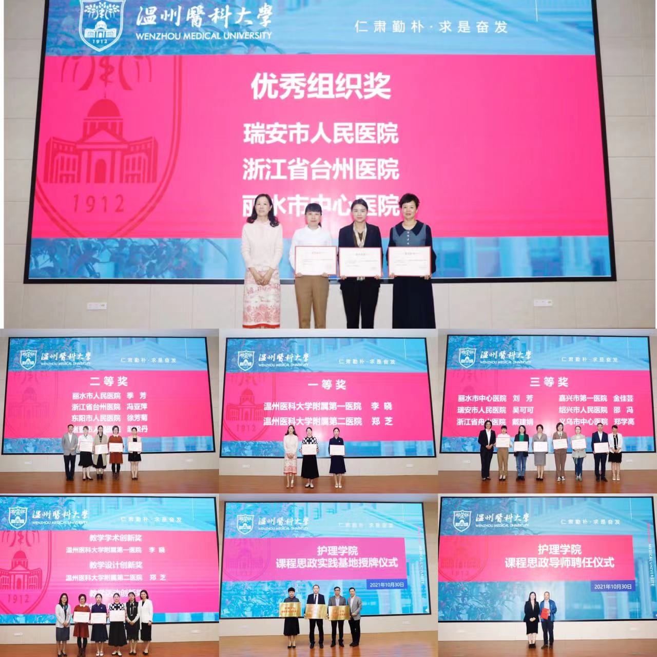 会议表彰了校第一届护理青年教师教学创新比赛获奖选手和单位,聘请李健老师为学院课程思政导师,并授牌颐乐如养老院、红景天养老院及温州市中心医院安宁疗护病房为学院课程思政教学基地。