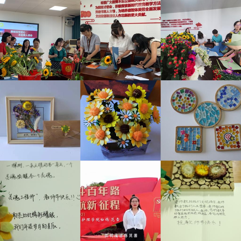 此外,学院通过短信向学院教师和临床教师送祝福,感谢所有老师为教育事业作出的贡献,并通过宣传橱窗,营造尊师重教的氛围。同时,举办创意花艺设计活动,观看电影《一生只为一事来》,让老师在忙碌工作的闲暇之余放松身心。同学们则拍摄祝福视频,专属定制包括手工花、减压小礼物、杯垫、拼接日历、戳戳绣等在内的一系列暖心小礼物,将满心的感恩与真挚送给老师们。
