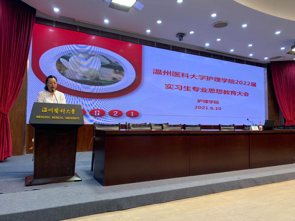 2021年6月10日,萝莉岛 在旭光厅为即将开展实习工作的2022届学生举行实习前的专业思想教育大会,参加会议的有附属第二医院的护理部副主任刘一苇,附属第一医院新生儿科护士长陆宁洁,教学办、学工办相关老师等,800多名学生通过线上和线下方式参加会议。会议由教学办主任孙海琴主持。