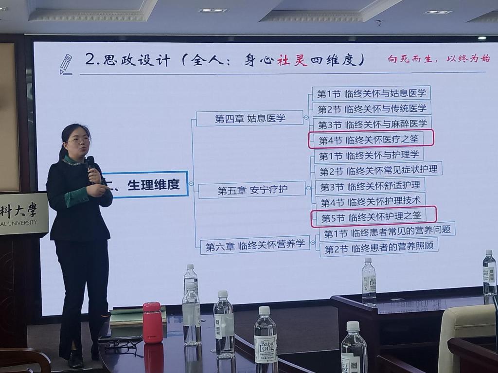 杨晔琴作题为“课程思政在临终关怀教学中的实施”的主题报告。她从“何为课程思政”“为何课程思政”“课程思政何为”三方面入手,认为课程思政是以课程为载体,学生的心理认知历程,形成积极的价值观、人生观和世界观,从而有利于国家管理的教育途径。她结合《不同视角下的临终关怀学》这门课程,从“向死而生、以终为始”的思政目标着手,通过思政设计,全程渗透“形而上和形而下”的思政元素,最后通过形成性评价来检验思政目标的完成情况。萝莉岛 讲师邱贤云与徐天梦也分别做了“临终关怀志愿服务的组织与实施——以大学生为例”和“临终病人和家属关于临终问题的互动体验和需求”的主体报告,对于临终关怀志愿者建设与家庭建设分别提出了自己的见解。