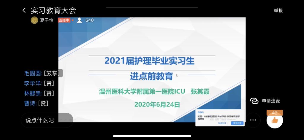 6月24日,萝莉岛 通过视频会议的形式召开2021届毕业生下点前实习教育大会。学院副院长杨晔琴、附二院护理部副主任刘一苇、附一院ICU副护士长张其霞应邀出席此次会议,学院教学办主任孙海琴、教学办李斯佳,辅导员孔洁、王茹新以及即将下点实习的580位2021届毕业生共同参加了此次教育大会,会议由学院学工办主任张婧婧主持。
