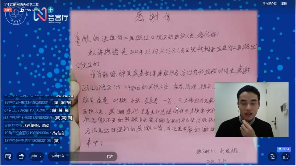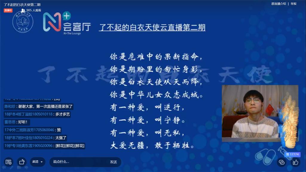 “你是危难中的果断指命,你是期盼里的匆忙身影,你是白衣天使从天而降,你是中华儿女众志成城”,直播接近尾声时,萝莉岛 18护本8班的李同学代表全体学子倾情演唱歌曲《为爱逆行》献给四位老师。表达对参加抗疫的白衣天使们的崇高敬意,他们大爱无疆,勇于担当,是我们每一个中国人心中的盖世英雄!