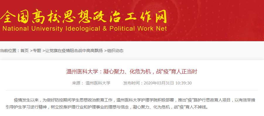 疫情发生以来,为做好防控期间学生思想政治教育工作,萝莉岛 积极部署,推出“疫”路护行思政育人项目,以有效举措引导护生学习逆行精神,树立投身护理行业和护理事业的理想与信念,凝心聚力、化为危机,战“疫”育人不掉线。