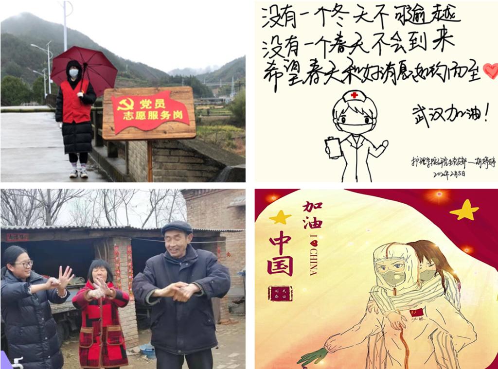 “正月初一,阖家欢庆之际/而你只一身白衣,挟简单行李/于瑟瑟寒风中踏上烈烈征程/远离至亲,奔赴最危险最繁重的疫情第一线……”这是18级护理本科杨同学的原创诗稿《白衣不负,前行不畏》。疫情期间,150余件学生原创的征文、美术、设计、视频类作品被线上征集、展出,以引导护生们主动思考,疫情当前,护生的责任和使命是什么,能为疫情做什么,不断推进以文化人、以文育人。疫情期间,未来的“白衣天使”们还在用行动丈量青春。“内、外、夹、弓、大、立、腕,我来演示一遍……”这是19级护理专科王同学在教家人七步洗手法。和王同学一样,全院近2300名护生响应学院发布的《至全体护生的倡议书》,做到“五带头”,自觉配合疫情防控工作,并利用自己的专业知识提升家人的防控意识和能力。学院9个学生党支部的158名党员护生还自觉发起一次特殊的主题党日活动,结合疫情防控开展一次讨论、许下一次承诺、发起一次倡议、进行一次宣教、发起一句话加油,发挥先锋模范作用,为打赢疫情防控阻击战助力。在村里、社区,护生们第一时间报名疫情防控排查工作,成为志愿者,她们用自己的青春力量参与战“疫”。