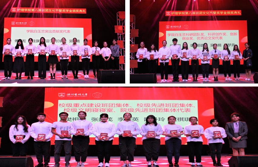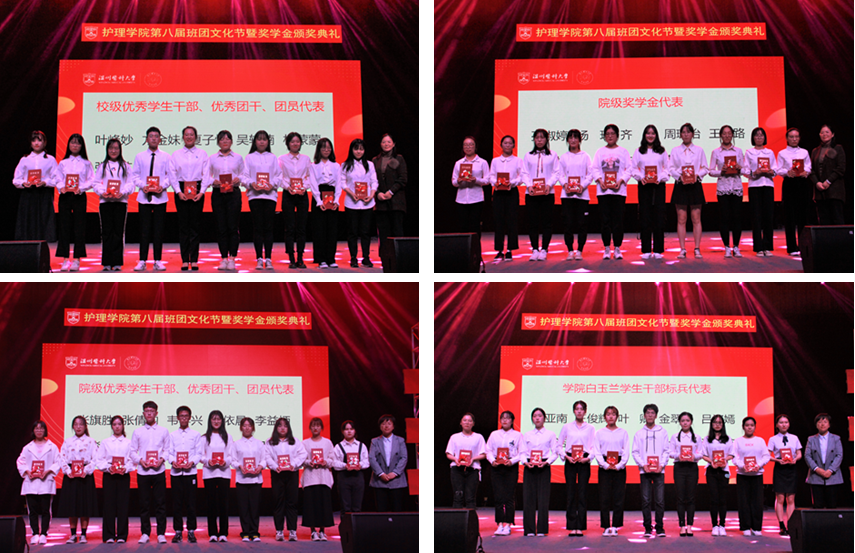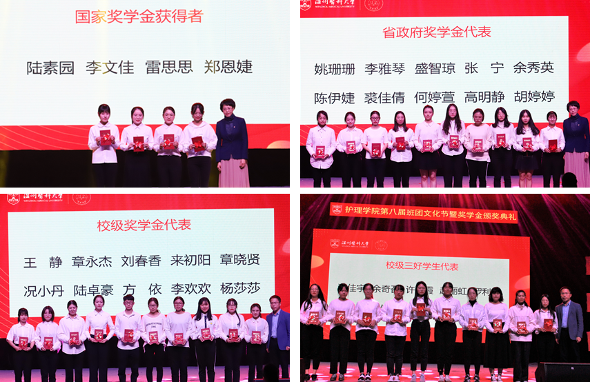 典礼伊始,国家奖学金、省政府奖学金、校级奖学金、校级三好学生、校级优秀学生干部、校级重点建设班团、校级先进班团、校级文明寝室、院级奖学金、院级优秀学生干部(优秀团干、团员)、白玉兰系列奖学金等数百名获奖学生受到表彰,激励着广大护理学子奋发向前,积极进取。学院党委书记陈慧,副院长蔡福满、杨晔琴,党委副书记涂艳玲以及学院办主任梁洁华、教研室主任陈军、教研室主任许芳芳为获奖学生代表颁发了获奖证书。优秀的护理学子站在舞台的中央,成为了全体护生最好的榜样,她们的成长也激励着现场的的每一位同学砥砺奋进、勇于争先!