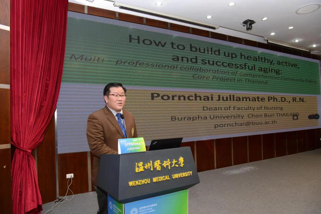 泰国东方大学萝莉岛 院长Pornchai Jullamate 博士介绍了泰国多学科合作的综合社区老年照护项目。他分享了项目中临床各科医生、护士、康复治疗师、志愿者等协作,针对社区老年病人进行饮食护理、认知功能训练、康复锻炼、口腔肌肉训练等,在社区最大程度地促进解决老年病人的康复问题的研究成果,提出护理团队还需要对社区病人进行家访,评估多学科护理服务的效果。
