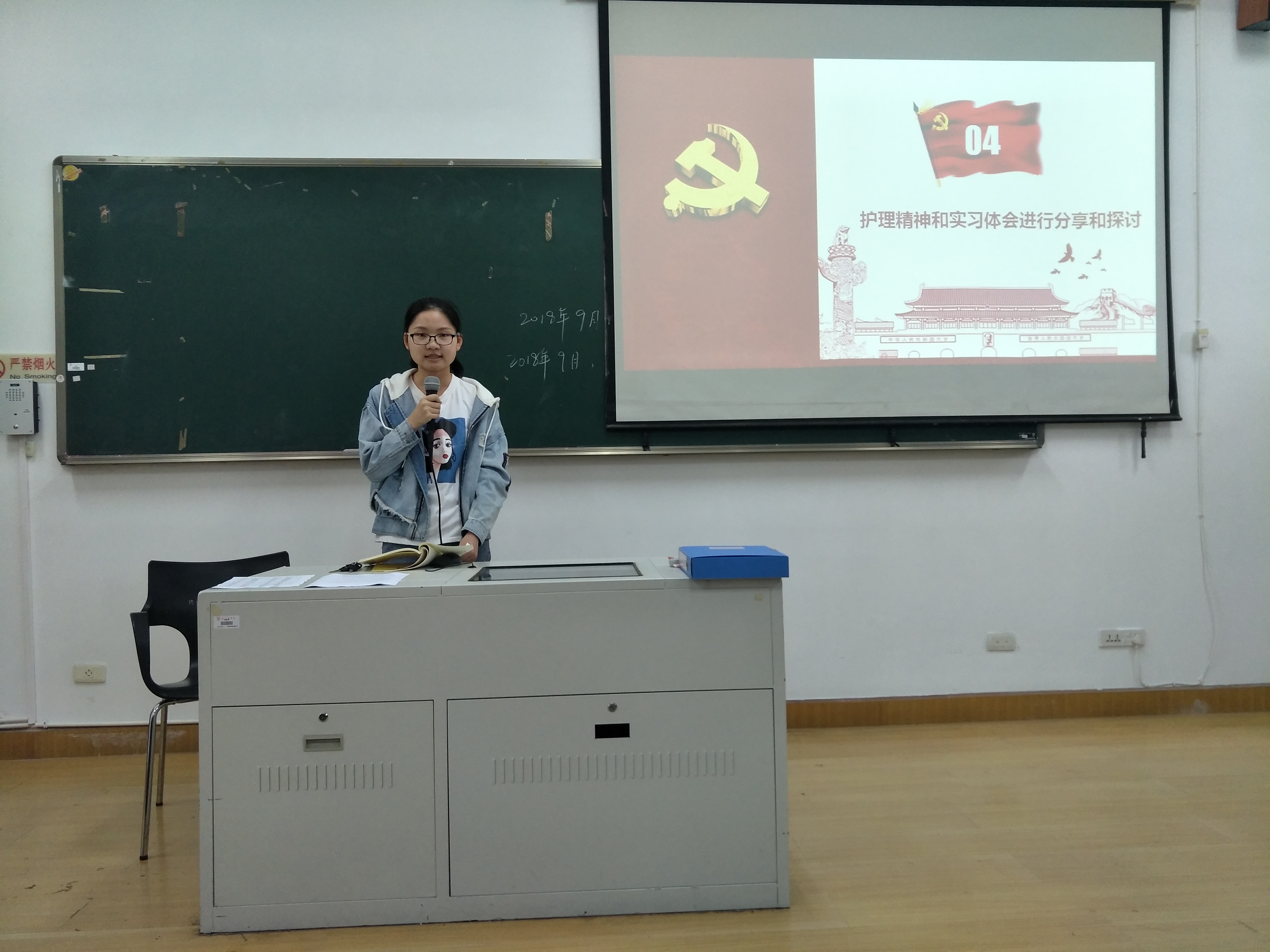活动中,两个党支部的党员们就护理人精神展开了探讨,并将之与过去八个月在医院实习岗位上的工作经历相结合,分享了自己对护理行业、护理岗位以及作为一名学生党员如何更好地在工作中发挥先锋模范作用的观点和看法。“护理精神的极致就是‘敬佑生命,救死扶伤,甘于奉献,大爱无疆’,对于我来说,也许需要用一生去诠释,但我会把它当做护理道路的指路明灯,努力前行。”学生第三党支部党员韩嘉莉说。