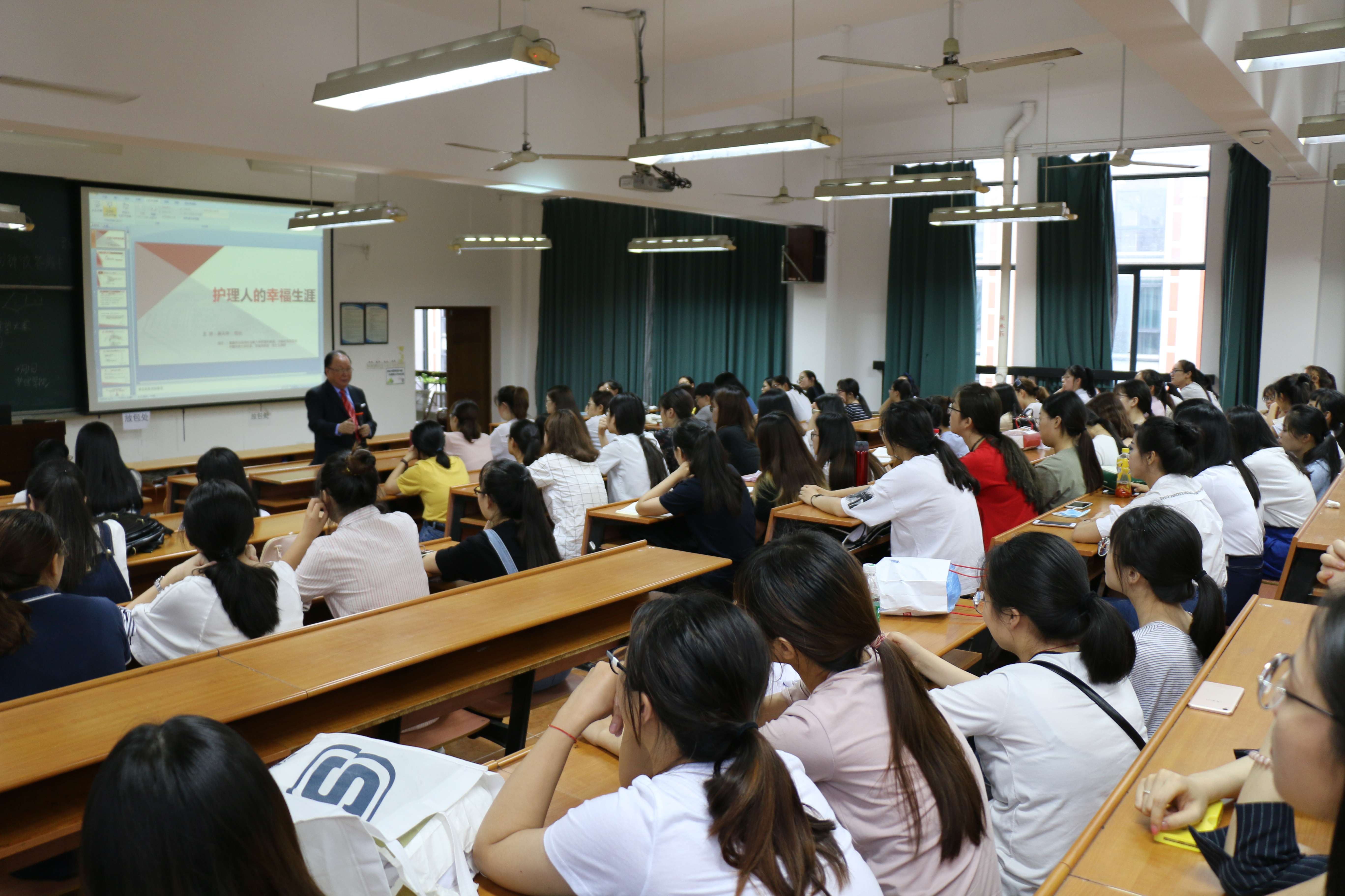 6月1日,美国托马斯大学中国总校区校长黄天中一行3人来访萝莉岛 ,为学院教师和学生分别进行了“护理人的幸福生涯”专题讲座。