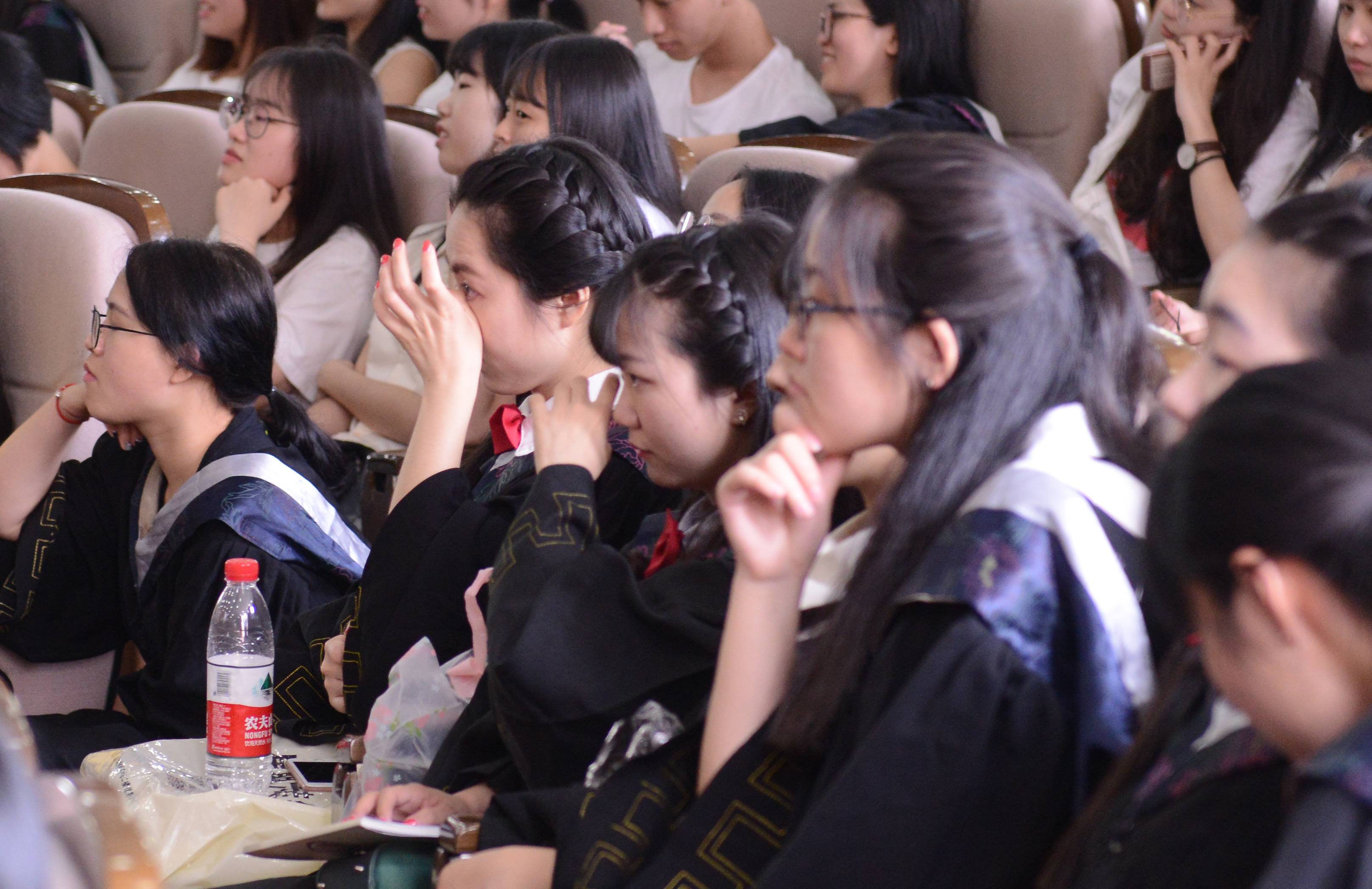 学位授予仪式上,350位护理本科毕业生依次上台向导师鞠躬,接受拨穗,并从卢中秋、蔡福满、杨晔琴、余昌妹、尹志勤、孙彩霞、徐小群、王爱霞、黄小琼、许虹波、符丽燕、陈军12位导师手中接过了校友荣誉证书并合影留念,为温医的护理学习生涯画上了圆满的句号。观礼的师生也用热烈的掌声为每一位毕业生送上了最真挚的祝福。
