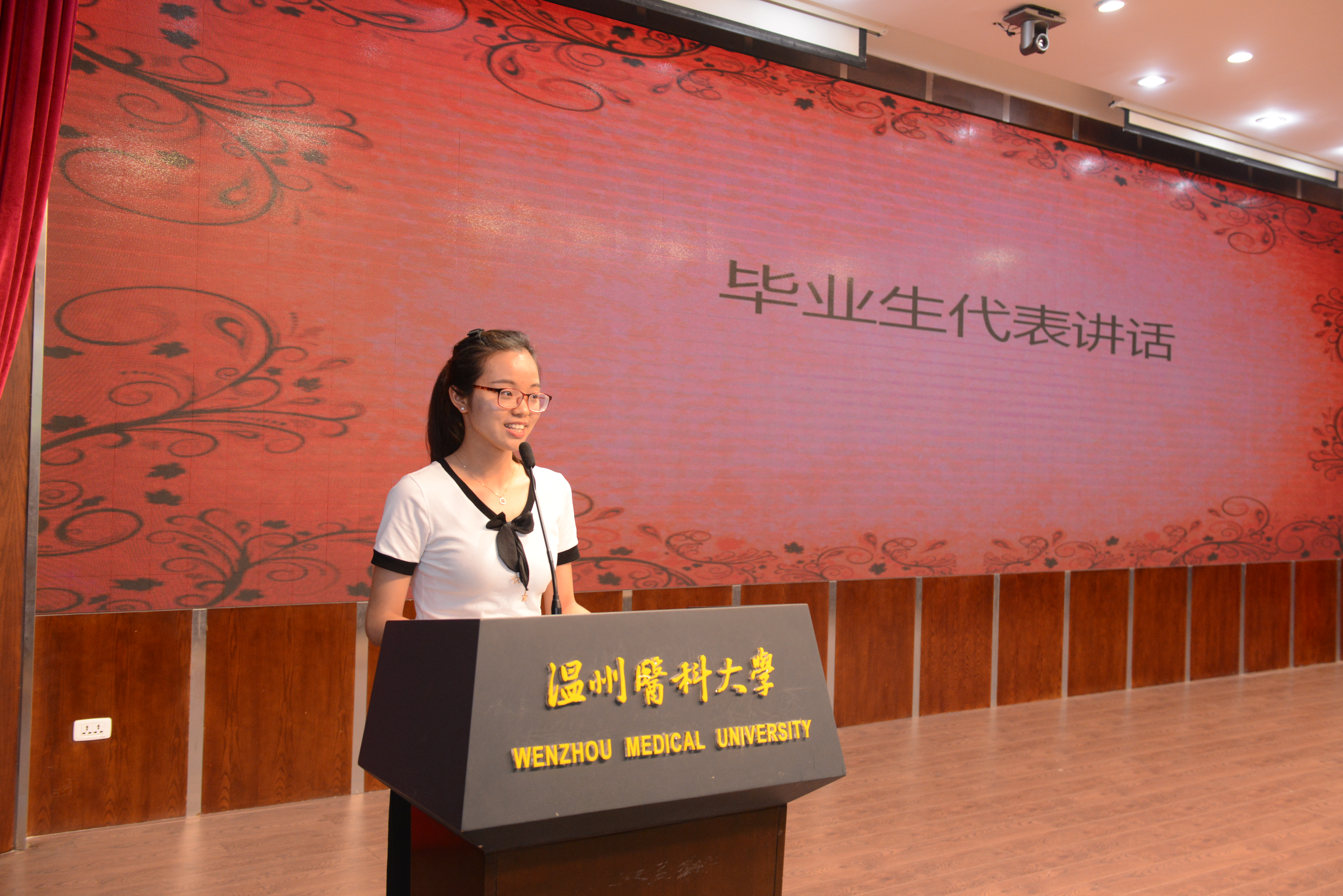 王啦啦同学作为毕业生的代表,向母校和老师表达了深深的感恩之情,并承诺“未来的我们将不会忘记我们所肩负的光荣使命,恪守护理人的誓言,用我们的知识和双手奉献社会,创造价值,为护理事业贡献出自己的一份力量。做一个对社会有用、对自己满意而又幸福快乐的温医人。”