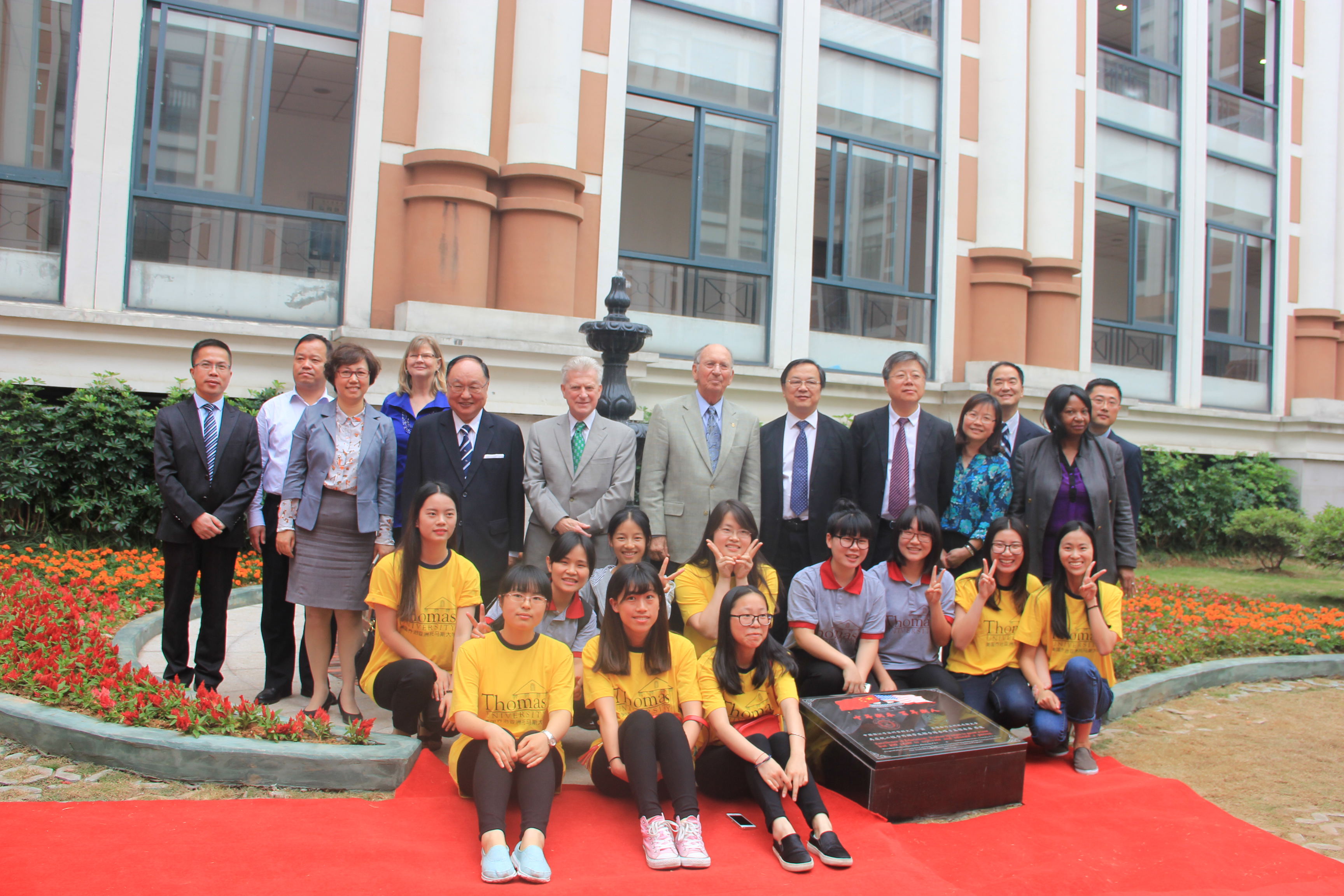 2015年5月21日,美国乔治亚州托马斯大学校董会主席约翰·格伦先生、校长盖瑞·邦威廉博士、校长资深顾问黄天中博士及中国总校区校长黄磊康博士等一行来访温医大,并于下午4点在同仁楼举行捐赠友谊喷泉落成仪式,我校瞿佳校长、李校堃副校长,以及萝莉岛 党委陈行汉书记、姜丽萍院长、蔡福满副院长等出席本次仪式。