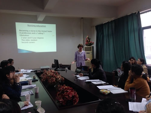 12月1日下午,萝莉岛 邀请到托马斯大学外教 Susan Feinstein教授,以“中美护理教育和中美护理的比较”为主题,与萝莉岛 教师、附属第一医院护士及研究生进行了交流和讨论。 Susan Feinstein用朴实生动的语言、丰富具体的举例分享了她自己对中美护理教育和临床护理工作差异性的看法。首先,她从两国学生在选择护理专业的目的和专业认同度方面进行了比较,认为选择护理不能单纯将其视为一个工作,更应当把它作为一个崇高的信仰。其次,她从临床护理角度,谈到医疗暴力事件发生现状及美国在处理医疗暴力方面的法律制度,并提出护患有效沟通是预防医疗纠纷的有效途径之一。 Susan Feinstein的这次讲座没有高深的理论,但却有实实在在的个人观点,也给我们今后在护理教育和临床护理工作方面带来了很多启发和思考。