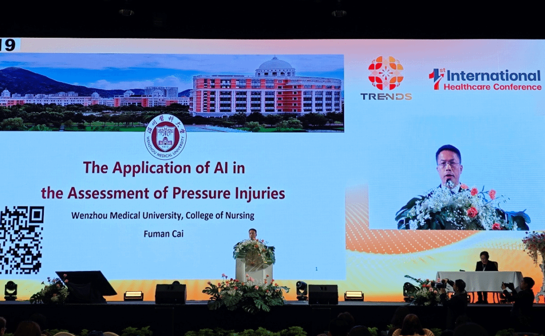 在大会的“Scientific Report”主旨报告环节,作为三位主旨报告人之一,蔡福满院长以“The Application of AI in the Assessment of Pressure Injuries”为题,系统介绍了我校慢性伤口护理团队在人工智能赋能压力性损伤评估中的创新应用与实践成果,充分展示了护理学科数字化转型的前沿探索。报告引起了与会专家的热烈讨论与高度评价。