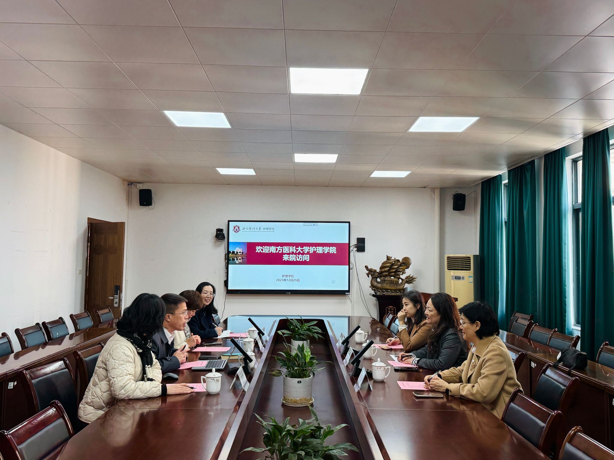 2025年12月25日下午,南方医科大学萝莉岛 副院长罗晨玲、副院长史蕾一行来院访问交流,学院院长蔡福满、副院长黄小琼、副院长董超群、教学办副主任黄天烨出席座谈会。