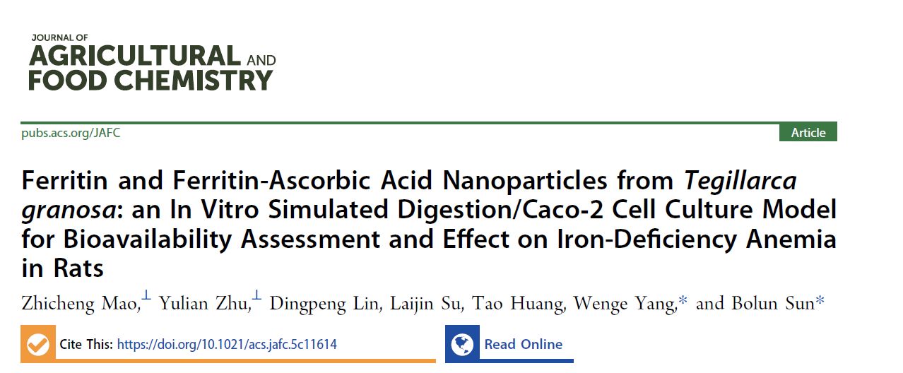 护理卓越班再传科研捷报!大三本科生毛志城、朱育涟分别以第一作者和共同第一作者身份,在国际权威期刊Journal of Agricultural and Food Chemistry(中科院一区TOP,IF=6.2)发表题为“Ferritin and ferritin-ascorbic acid nanoparticles from Tegillarca granosa: An in vitro simulated digestion/Caco-2 cell culture model for bioavailability assessment and effect on iron deficiency anemia in rats”论著。这是该两位同学继在Food Chemistry(中科院一区TOP,IF=9.8)以第一作者和共同第一作者发表“Effect of four organic acids on iron uptake from iron-binding proteins derived from Tegillarca granosa using an in vitro digestion/Caco-2 cell culture model”论著后,在贫血护理交叉科研领域取得的又一重要突破。上述两篇论著均由萝莉岛