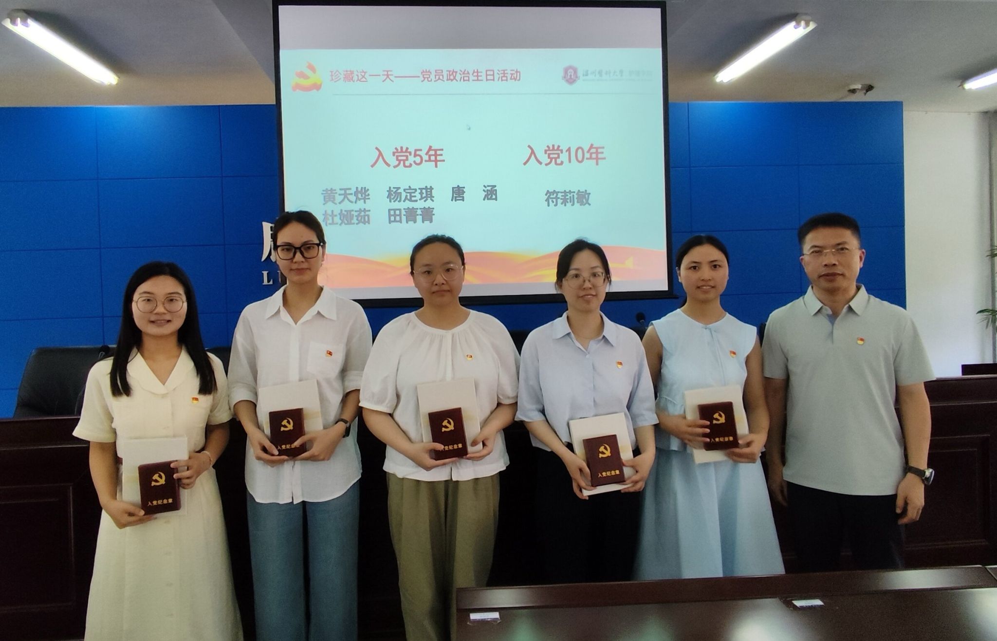 参观结束后,学院党委举行了简朴而庄重的党员“政治生日”仪式。蔡福满院长为入党5周年的黄天烨、杨定琪、唐涵、杜娅茹、田菁菁老师,以及入党10周年的符莉敏老师颁发纪念章。王敏书记为入党15周年的黄盼、刘艳佳老师,以及入党20周年的涂海霞、朱莲莲老师颁发纪念章。