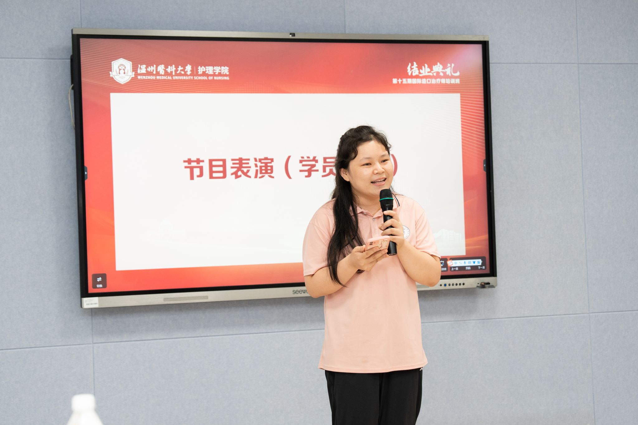 来自澳门的学员代表杨小英发言,对老师们的辛勤付出表示感谢,并表态将把学校所学到的知识和技能运用到实践中,为造口伤口专业的发展贡献力量。