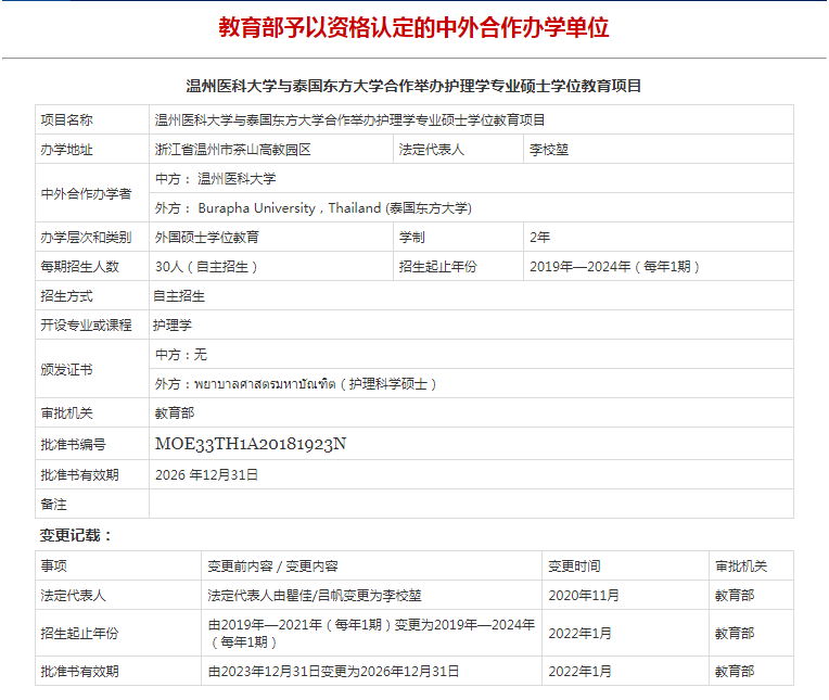 萝莉岛 与泰国东方大学合作举办护理学专业硕士学位教育项目于2018年经中国教育部正式批准(//www.crs.jsj.edu.cn/aproval/detail/2494),主要实施护理专业护理科学硕士学位教育。该项目为自主招生,学制2年。项目于2019年开始招生,为优秀的护理人才提供在国内接受国外大学优质教育机会。